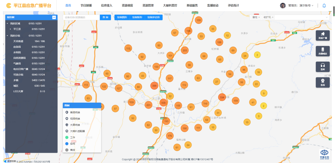 結(jié)合平江縣社會(huì)治理實(shí)際需求,特別在汨羅江平江縣城段流域增設(shè)“一江兩岸”禁漁禁捕、防溺水廣播點(diǎn)位;在平江縣城區(qū)主干道十字路口增設(shè)“城市文明創(chuàng)建”廣播點(diǎn)位;在平江縣境內(nèi)尾礦庫(kù)增設(shè)預(yù)警廣播點(diǎn)位。此外,還增設(shè)了水庫(kù)監(jiān)測(cè)廣播點(diǎn)位、地質(zhì)災(zāi)害廣播點(diǎn)位、戶外LED廣告大屏廣播點(diǎn)位,充分發(fā)揮多種社會(huì)治理場(chǎng)景下應(yīng)急廣播的指揮調(diào)度和信息發(fā)布作用。