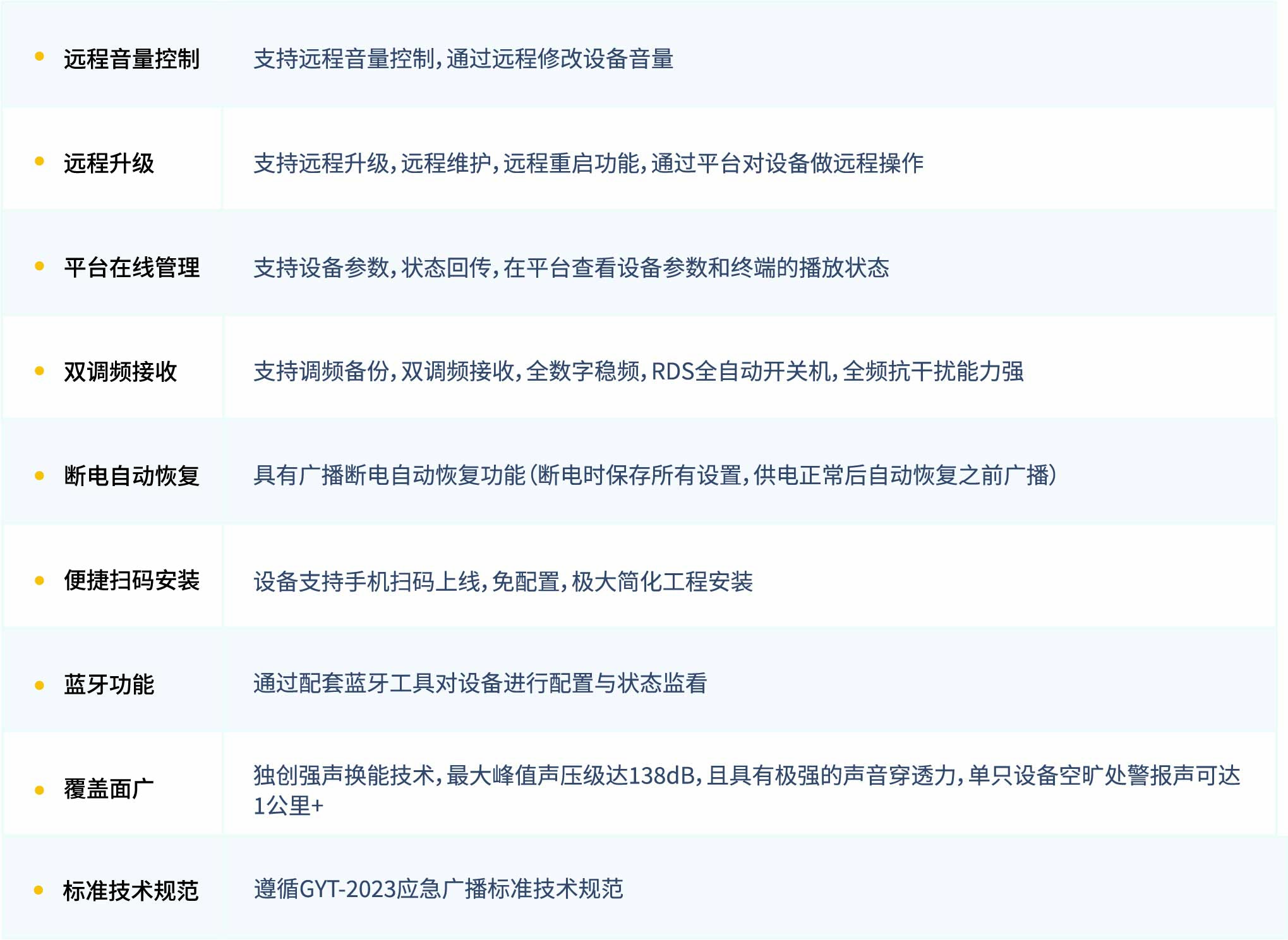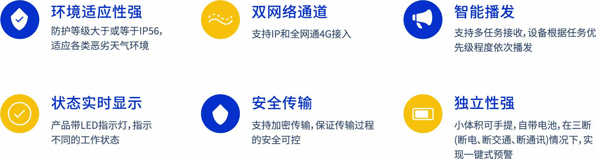 便攜式應急廣播強聲終端是—款針對戶外可移動式應急預警廣播智能終端產品,是應急廣播中實現覆蓋 “ 最后一公里 ”的重要產品,集音頻接收處理,放大于一體。主要是用在戶外的場合,在三斷(斷電、斷交通、斷通訊)情況下,支持—鍵式預警,高效進行語音宣導、管控和指揮,及時預警、及時干預、及時疏導,保障人身安全。產品支持IP、TS、RDS、4G四種接收模式,產品音頻部分采用高低音喇叭分頻設計輸出音質好。