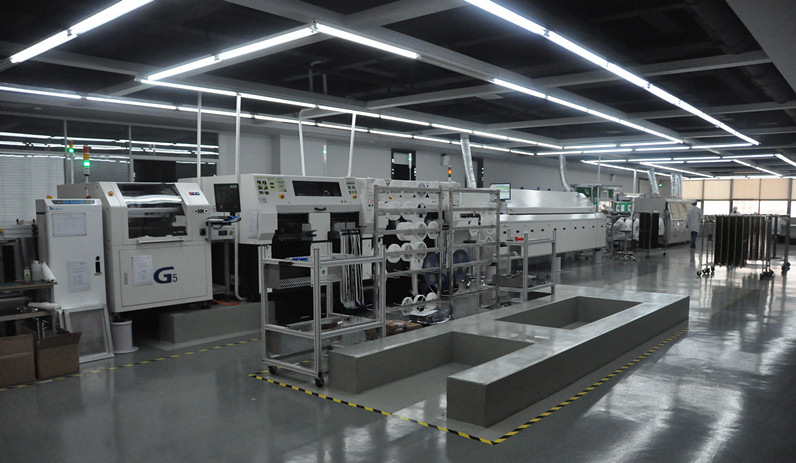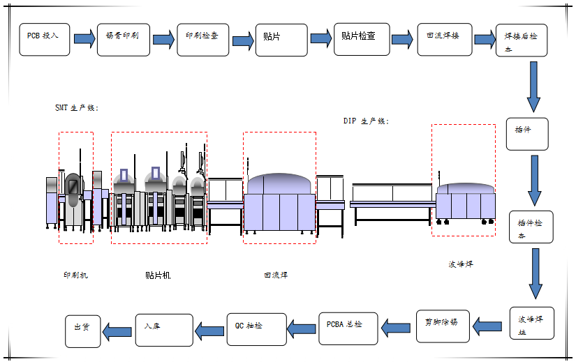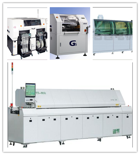 貼片車(chē)間生產(chǎn)線(xiàn)目前有1條SMT(表面封裝焊接技術(shù))與DIP(通孔封裝焊接技術(shù))組成。其中SMT設(shè)備有全自動(dòng)上板機(jī)1臺(tái),全自動(dòng)傳送接駁設(shè)備3臺(tái),GKG全自動(dòng)印刷機(jī)1臺(tái),Panasonic-AM100高速貼片機(jī)2臺(tái),JTE全自動(dòng)熱風(fēng)回流焊爐1臺(tái),錫膏攪拌機(jī)1臺(tái)及全自動(dòng)烘箱1臺(tái)組成;DIP設(shè)備有全自動(dòng)插件線(xiàn)2條,日東全自動(dòng)波峰焊接爐1臺(tái),全自動(dòng)出板接駁設(shè)備1臺(tái),電容成型機(jī)1臺(tái)及電阻成型機(jī)1臺(tái);周邊輔助設(shè)備空壓機(jī)1臺(tái),冷干機(jī)1臺(tái)及風(fēng)機(jī)1臺(tái)。